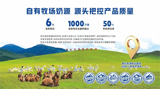 正在奶源扶植方面,那拉集团阐扬龙头企业带动感化,正在新疆建成六大自有牧区,面积近1000余万亩,此中无机牧场无机率达50%以上。