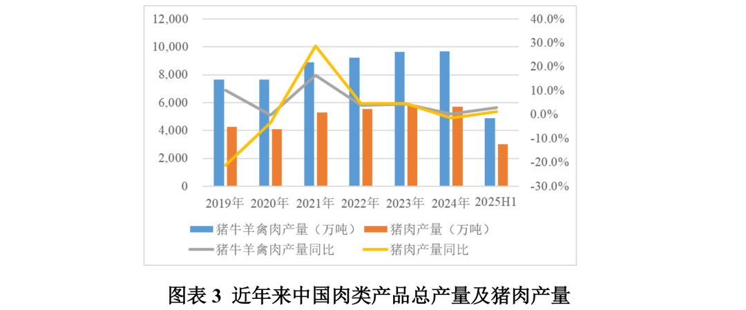 屠宰及肉类加工行业(以下简称“肉类加工行业”)次要涉及猪、牛、羊、禽的屠宰、朋分、加工、包拆、冷藏等,产物次要包罗新颖、冷藏或冷冻肉类和食用内净等。2025年1-6月,中国肉类产物出产消费量中,猪肉产物占比正在60%摆布,因居平易近饮食布局的特点,猪肉正在中国肉类产物出产和消费中一直占领支流地位,且肉类消费以鲜肉为从,肉类产物的深加工率低于美国、日本、欧洲等国,因此生猪屠宰及加工是肉类加工行业最次要的形成部门。
